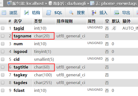 TAG页面作为主要的长尾关键字,是很重要的SEO一部分,所以做好TAG的设置很重要。如下图所示TAG的数据表字段.因为TAG会用到tagname作为伪静态的URL地址,所以tagname是很重要,而默认系统数据库只有20,所以这个肯定太短了,肯定不够用,个人建议修改到至少60,推荐120,另外tagtitle这个字段默认也只有60,对于稍微长一点的长尾TAG,也不够,建议修改加长,推荐120